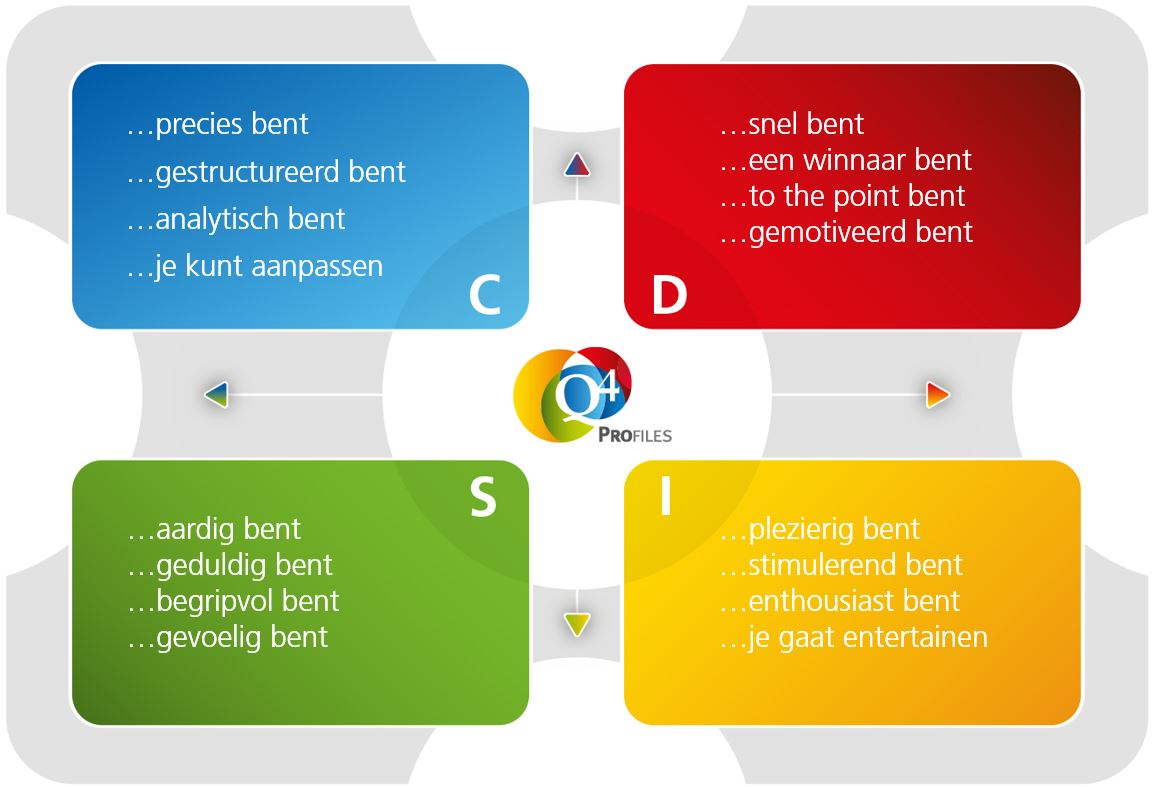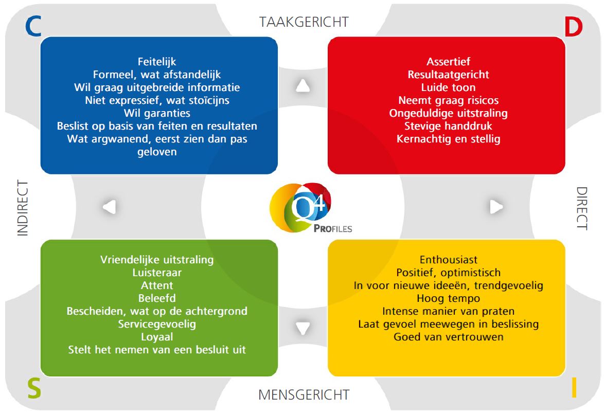 “Om daarachter te komen, kom je al heel ver door deze persoon gewoon eens te observeren. Let op hoe degene praat en op welke manier er vragen worden gesteld. Je kunt al veel opmaken uit de manier hoe mensen praten en daaruit kan je vaak concluderen of iemand meer direct of indirect georiënteerd is. Iedereen heeft ze allebei, alleen heb je vaak van het een wat meer dan van het ander. Maar er zijn natuurlijk veel meer herkenningspunten waar je op kan letten. Zoals de manier van lopen en iemand benaderen. Dit soort gedragingen geven je als trainer richting in het bepalen wat voor temperament iemand heeft. In principe werken wij met ons systeem volgens vier verschillende temperamenten: consciëntieus, dominant, stabiel en interactief. Die geven aan wat je voorkeur is wat betreft de communicatievolgorde. In onderstaande afbeelding zie je overzichtelijk wat dit betekent voor iemands eigenschappen.”