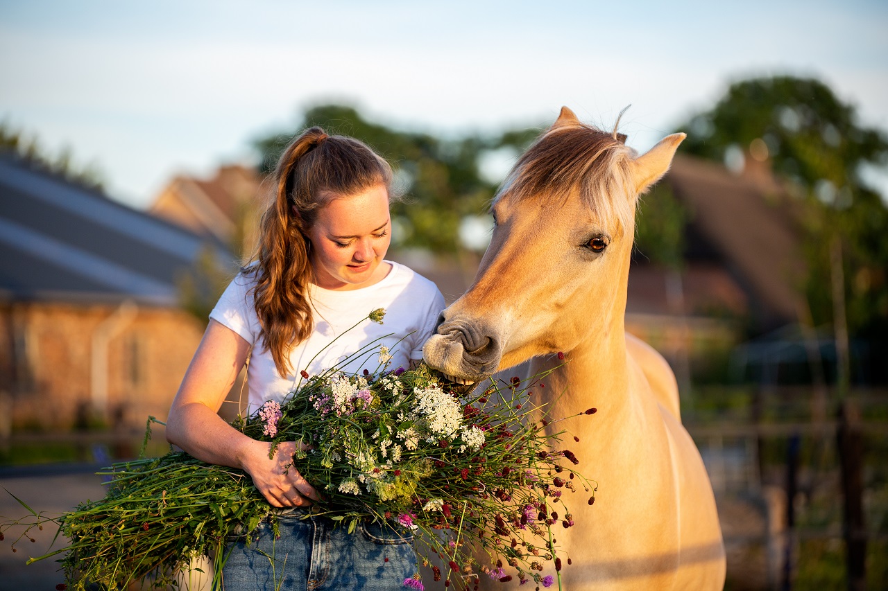 “Het begon allemaal met het delen van mijn eigen paddock paradise op social media en dat ging over in open dagen en het aanbieden van diensten voor mensen die ook interesse hebben om er zelf een te creëren. Inmiddels heb ik mijn baan in loondienst opgezegd om dit fulltime te doen. Op dit moment help ik vooral particulieren om hun eigen perceel aan te passen naar een paddock paradise. Soms help ik mee vanaf het begin met het schetsen en alles, maar mensen benaderen mij ook wanneer ze vastlopen of tips en ervaringen willen hebben. Elke stap van het proces kan ik bij helpen, alleen de uitvoering doe ik niet. Bij veel van mijn klanten moet het een verlengde worden van iemands achtertuin, waardoor het erg belangrijk is dat het er mooi uitziet. Daarbij kijk ik ook naar welke planten we erbij kunnen betrekken voor meer biodiversiteit en variatie in de voeding van het paard. Ik organiseer ook workshops waarin mensen in een groepje samen kunnen brainstormen en een ontwerp maken voor hun eigen paddock. Daarnaast merkte ik dat er nog weinig kennis was over eetbare planten en bloemen en daarvoor heb ik allerlei materialen ontwikkeld zoals de wildplukkaarten en plukwandelingen. Mensen zijn al snel bang voor onkruid in de wei, maar de meeste dingen zijn gewoon super gezond en kun je gerust laten staan. Ik heb ook zaden in het assortiment; bloemen en kruiden en gemengde graszaden. Het zijn wel kleine zakjes, dus voor grotere oppervlakken is dat niet interessant, maar wel voor mensen die hun wei langzaam gevarieerder willen maken met meer kruiden. Het is ook geschikt voor mensen om thuis te zaaien, zodat ze het kunnen plukken en meenemen naar hun paard.”