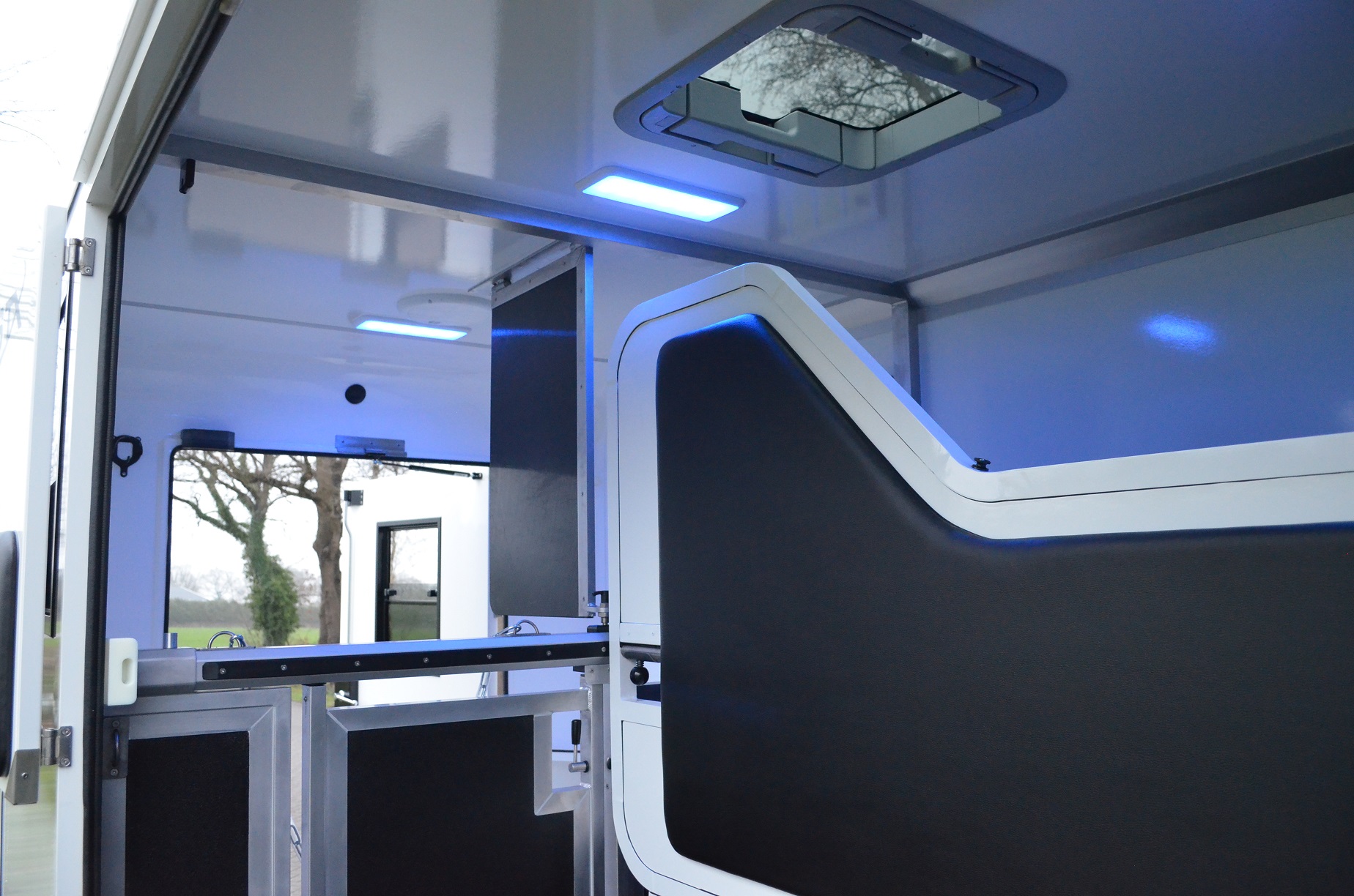 Wanneer je een paard aan het laden bent, wil je alles goed kunnen zien, maar wij kunnen ons goed voorstellen dat het paard het daarna wel fijn vindt als het licht iets gedimd wordt. Volgens Stefan hebben veel vrachtwagens tegenwoordig dag- en nachtverlichting. “Witte felle ledlampen voor tijdens het laden, het opzadelen wanneer het buiten donker is of wanneer je in de wagen bezig bent. Je wilt alles dan goed kunnen zien en genoeg verlichting hebben. De nachtverlichting is daarentegen blauw zacht ledlicht en een stuk fijner voor je paard als je onderweg bent en het donker is buiten. Het verblindt de paarden niet en is rustiger voor de ogen. Daarnaast hebben de grote vrachtwagens in het paardengedeelte ook rode remverlichting. Wanneer je remt gaat deze net als je normale remlichten branden. Na verloop van tijd zullen paarden dit herkennen en kunnen ze beter anticiperen op het remmen.”